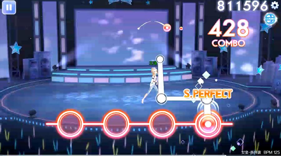 最后,《女皇》歌曲的结尾部分会出现一些长按滑动音符,其他音符和前部分比较详细,主要都是普通音符、滑动音符穿插其中。这里首先需要保证更高分值,长按滑动音符的准确率,另外这里注意滑动音符的方向,不要在结尾出现MISS,而没有拿到歌曲的ALL COMBO通关,这样会非常可惜!