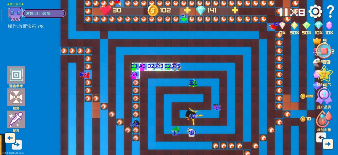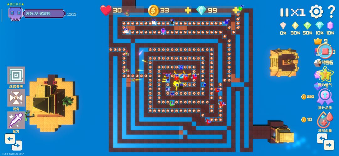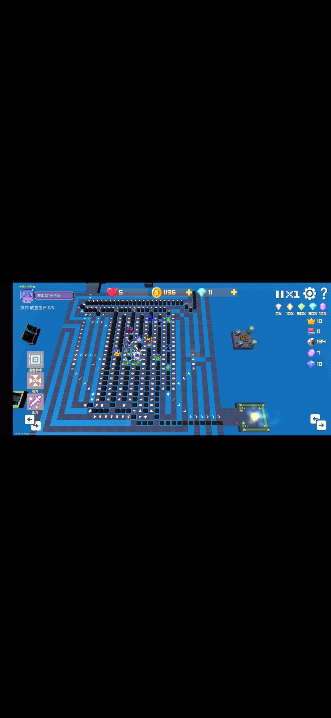 这款宝石TD在迷宫玩法上基本复刻了原始版本,唯一的不同就是把怪物第一个站点放出来了有6个迷宫点位(地图左上角为第一个)这样的话就有4进3出,怪物共计7次进迷宫。