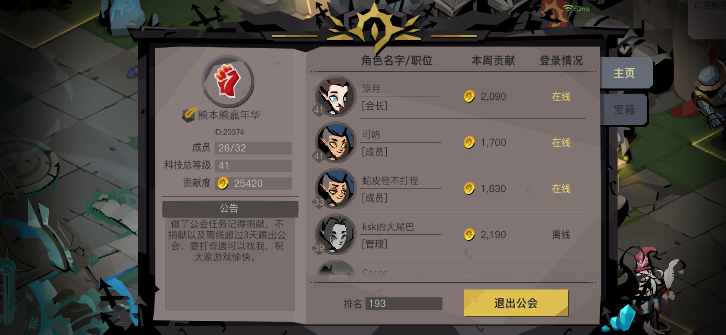 ,每天晚上有的大佬有时间可以说一下带着打打暗金图,只要有时间就会有人带的,在没进暗金图之前基本不会有大佬带,所以自己努努力,如果自己有事找会长请假如果批准会长不会踢的。欢迎大家加入本工会🤗🤗🤗🤗🤗🤗