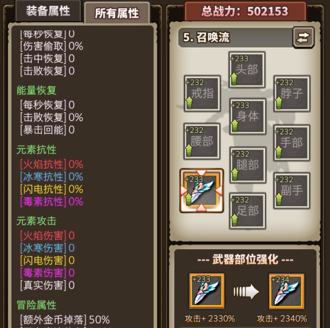 第一张图是我只带了召唤无头战士武器的伤害图和属性图。此时的攻击力是234484,真伤是0,本体打怪的伤害是68000左右,召唤出来的小本体伤害是26000左右。