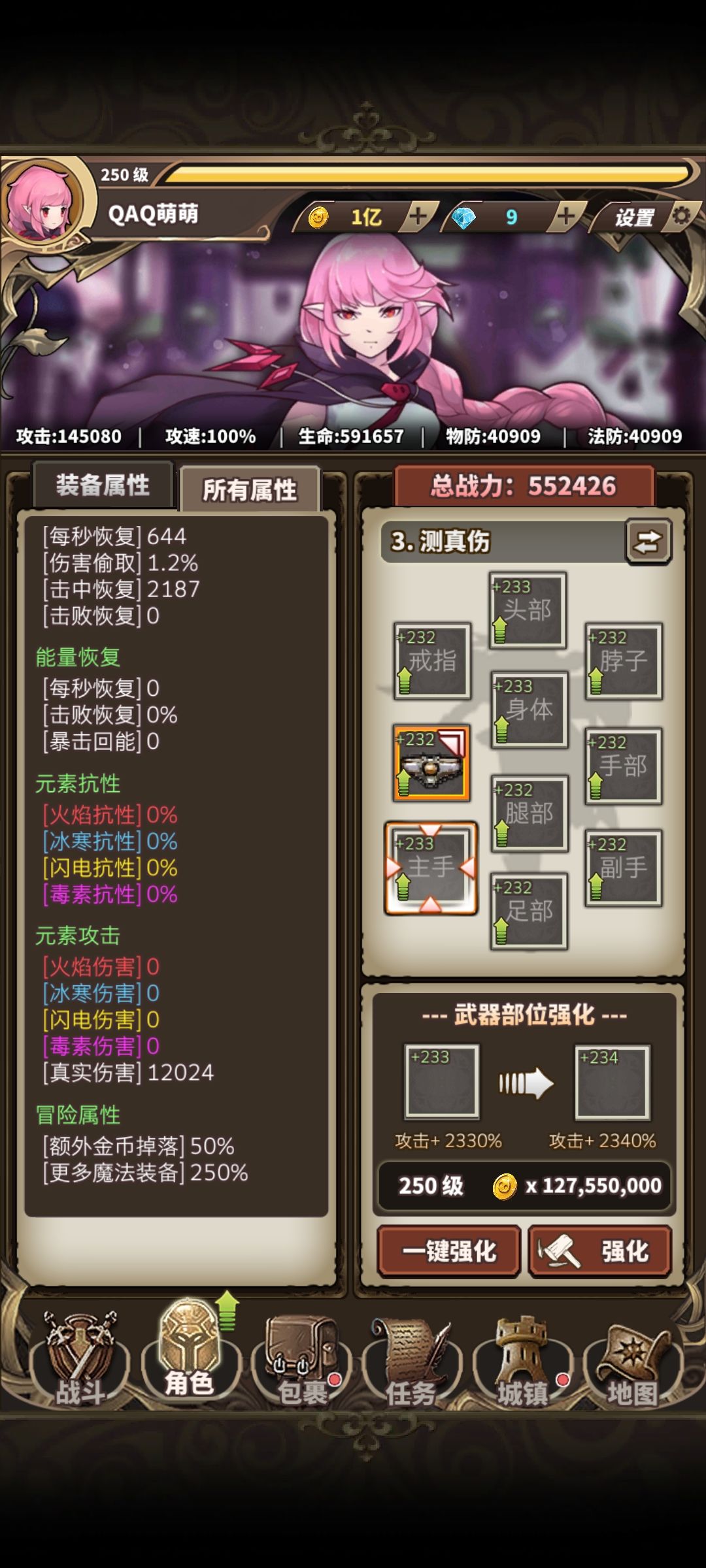 为了测试的严谨性,我再加了一件7494真伤的装备,但这个装备改具备攻击力,所以我们本体的攻击面板和真伤面板也变了,那会不会和我们的理论结果不同呢?请看下面结果