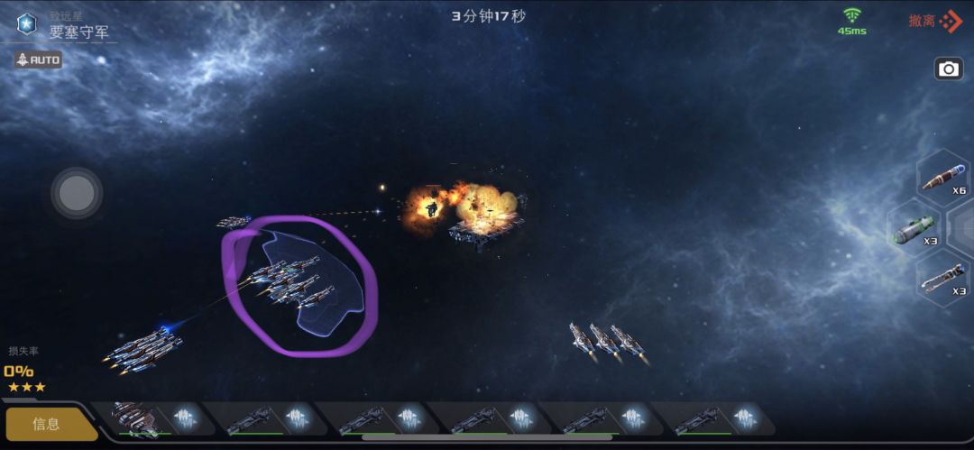 要注意的是,王八最好不带速度,战巡开火前王八不能跑到战巡前面去。因为战巡位置靠前的话就可以直接自动锁定到隐形里面的船而不是飞过来的小飞机。王八如果跑到战巡前面去的话战巡就会打飞来的小飞机,这时就得手动让战巡锁隐形里面的无畏,会浪费4-5s时间。如紫色圈所示: