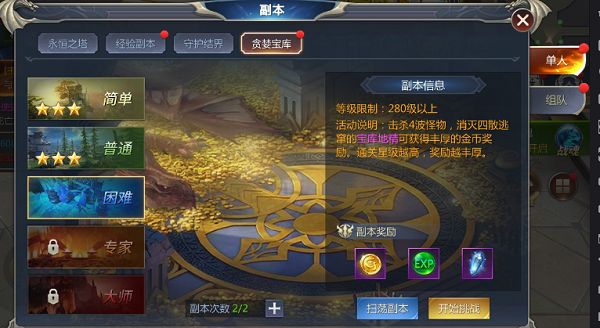 贪婪宝库属于单人副本,有五种难度,玩家可根据自身等级选择已解锁的副本难度挑战,难度越高,获得的奖励也会越高。