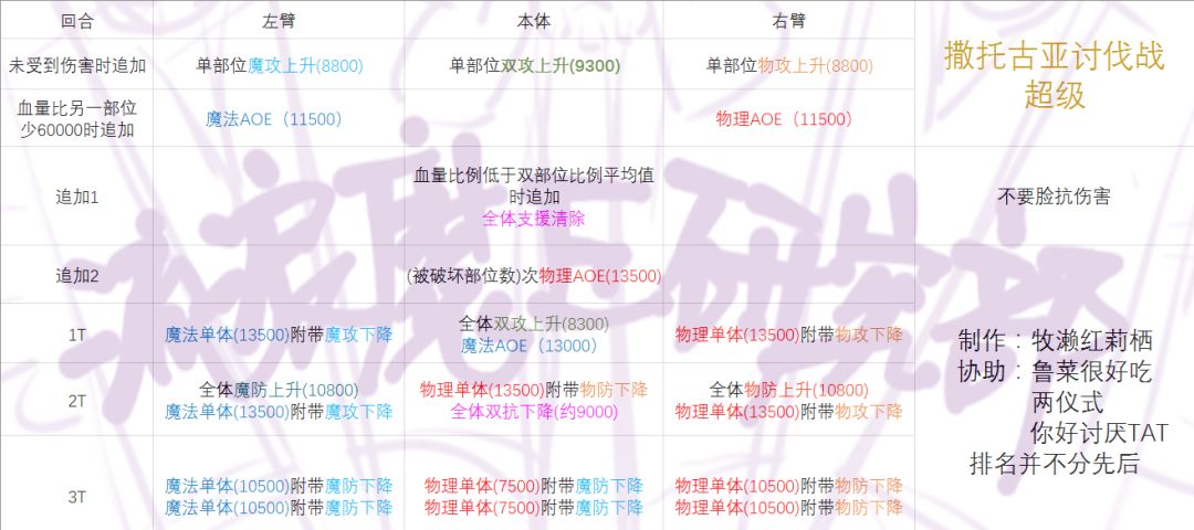123T正常给盾,,456T找机会给克总,正常爆破即可,物理队比魔法队多的一点是物理队请绝对不要让BOSS触发清支援。