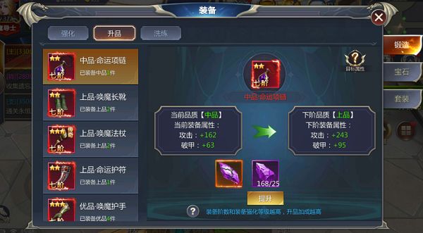 当等级达到200级,就会开启装备升品系统。装备的品质分为,下品、中品、上品、优品、精品,升品可提升装备的基础属性和强化属性,装备阶数和强化等级越高,则加成越高,而将基础装备、神器升品至同品质可获得大量目标属性加成。