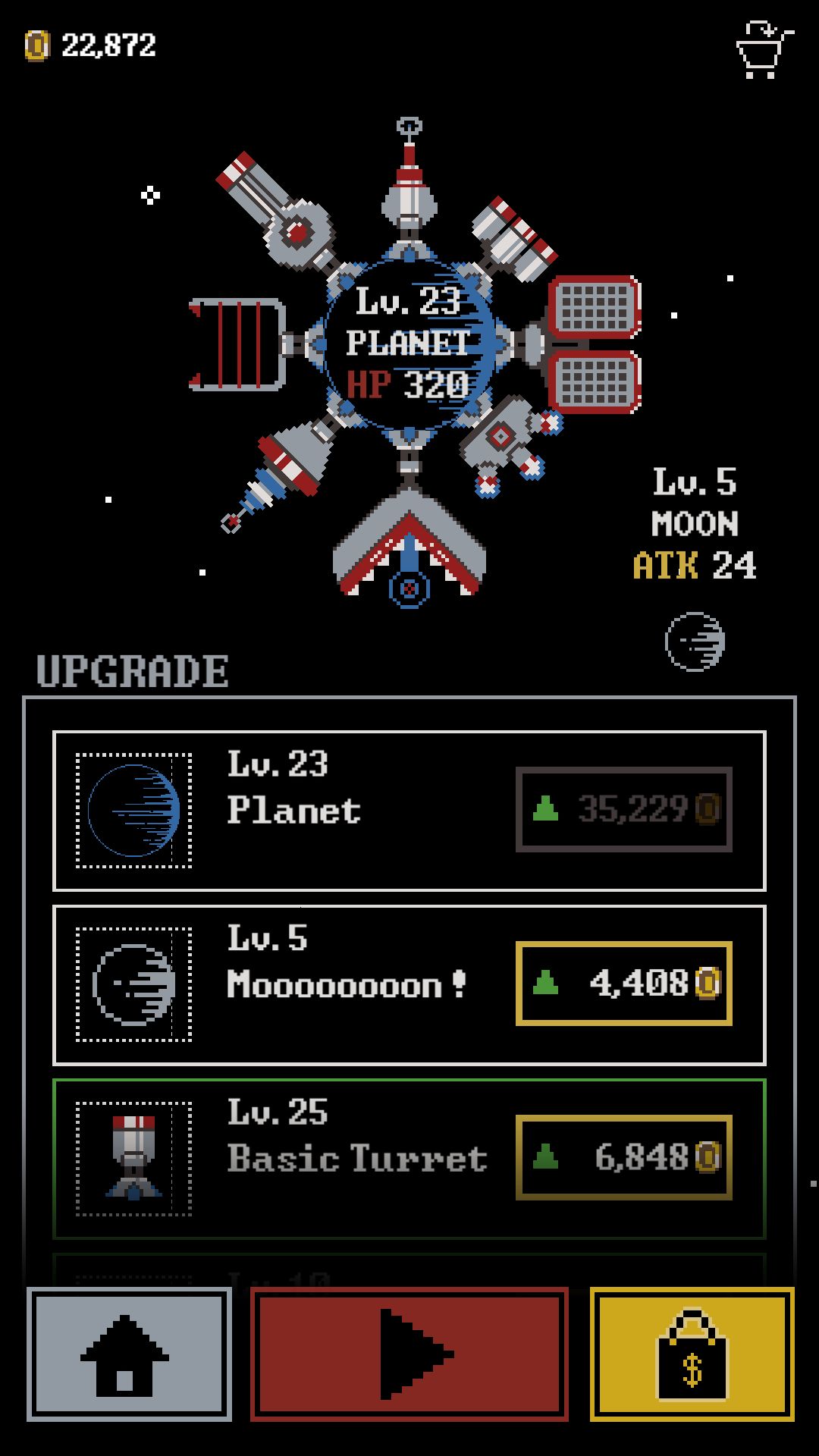 武器全买了,强迫症原因..最后一个不知道什么用..25秒..唉..然后武器等级的话星球23级,月球5级(强迫症⚘(∀`ฅ*))初始小枪25级,一次三发的小枪10级,Y型小枪5级,Push!(这个真不知道怎么形容..)5级,一次三发的小枪(别问我怎么和前面重复了..我还是不知道怎么形容..就是Rapid Laser)15级,小榴弹枪1级,40米激光!!!15级,大追踪炮1级,小追踪炮8级(这个因为没钱无法凑到10级,强迫症抓狂!(╥╯﹏╰╥)ง)冰冻、钻头、青蛙嘴都是1级,大榴弹枪1级,范围榴弹枪1级,EMP、黑洞、三紫、隐藏武器通通1级~