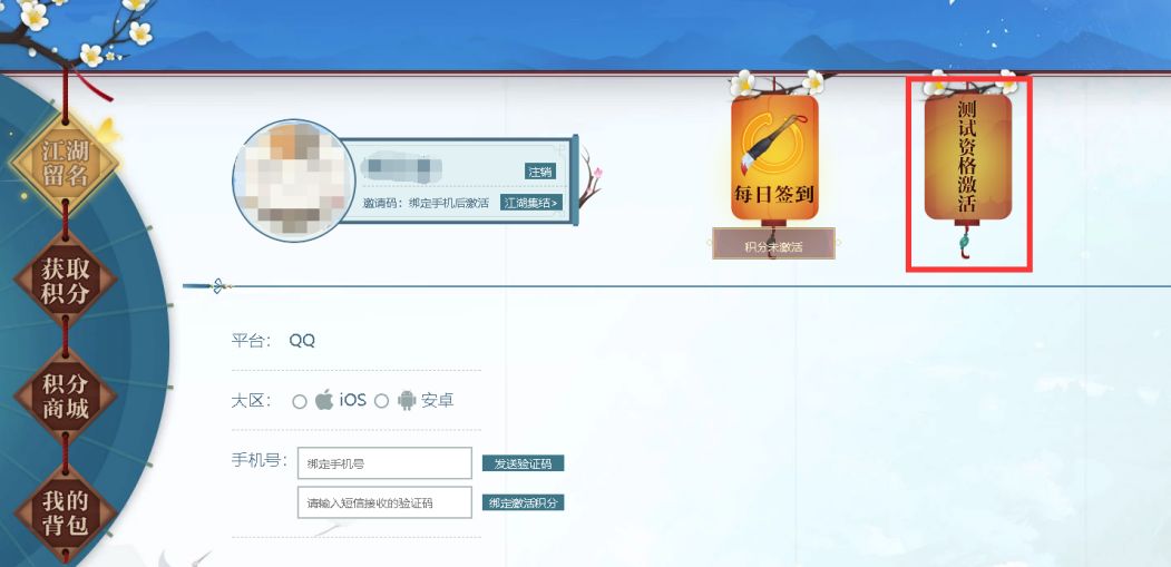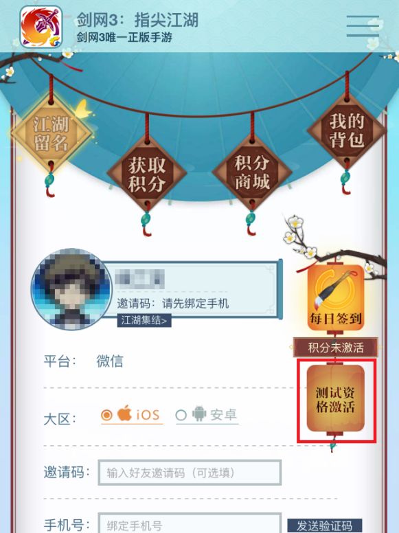 2. 机智的少侠点一下这个测试资格激活的灯笼o(* ̄3 ̄)o 尚未预约注册的玩家需要先填入手机号预约游戏。(邀请码这里并不是激活码哦!)