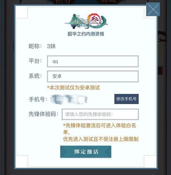 3. 少侠你马上就要成功啦,输入你的体验码吧,(没有预约的少侠,需要先绑定手机号进行预约哦)祝你游戏愉快~╮( ̄▽ ̄)╭
