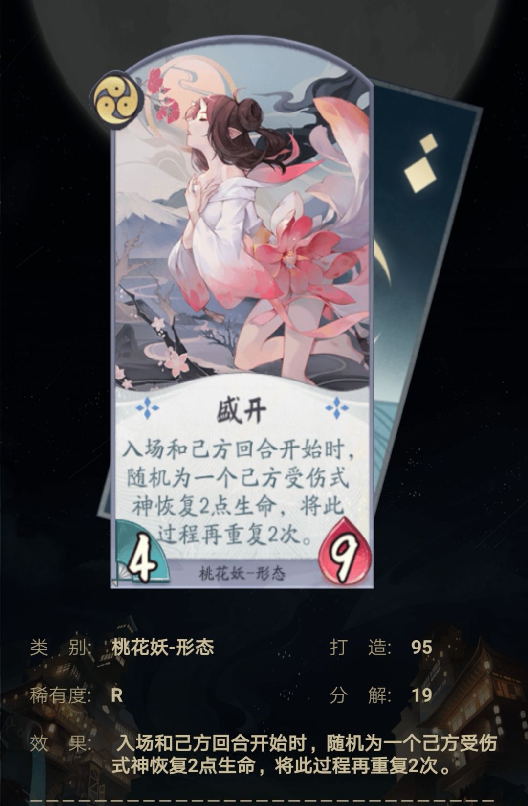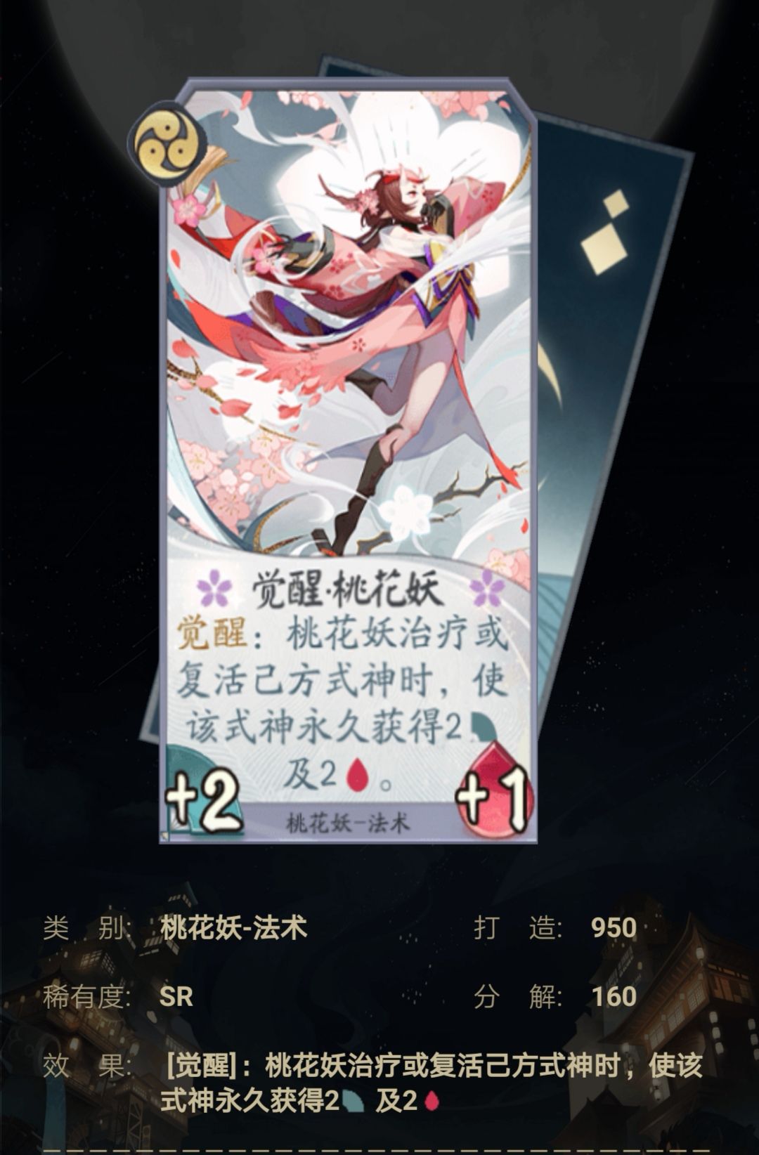 桃花妖的唯一觉醒牌,觉醒之后能使友方式神疯狂叠加属性,且还是永久,非常强,配合盛开能使后期的全部友方式神获得强大的身材来进行赖场。