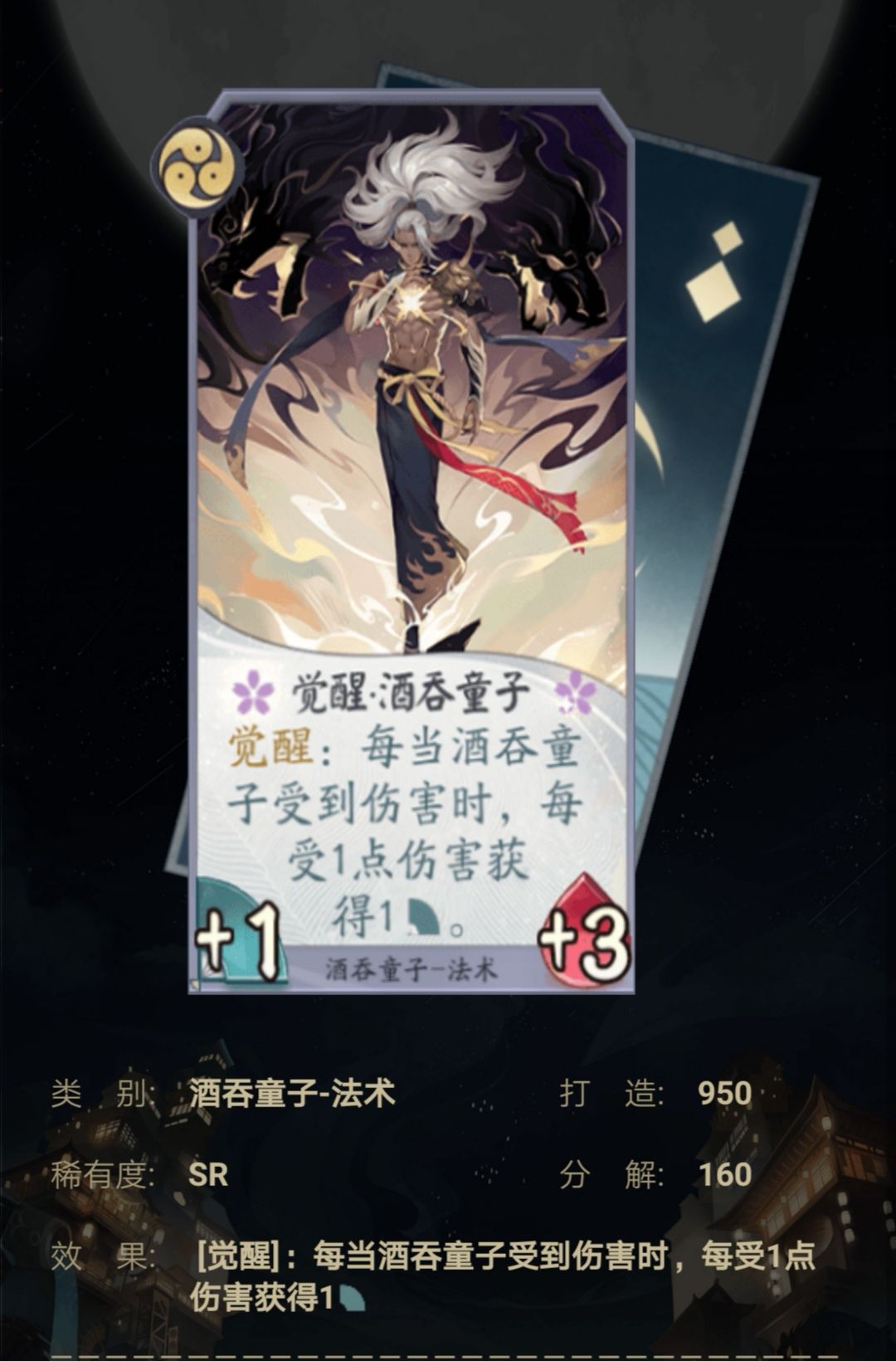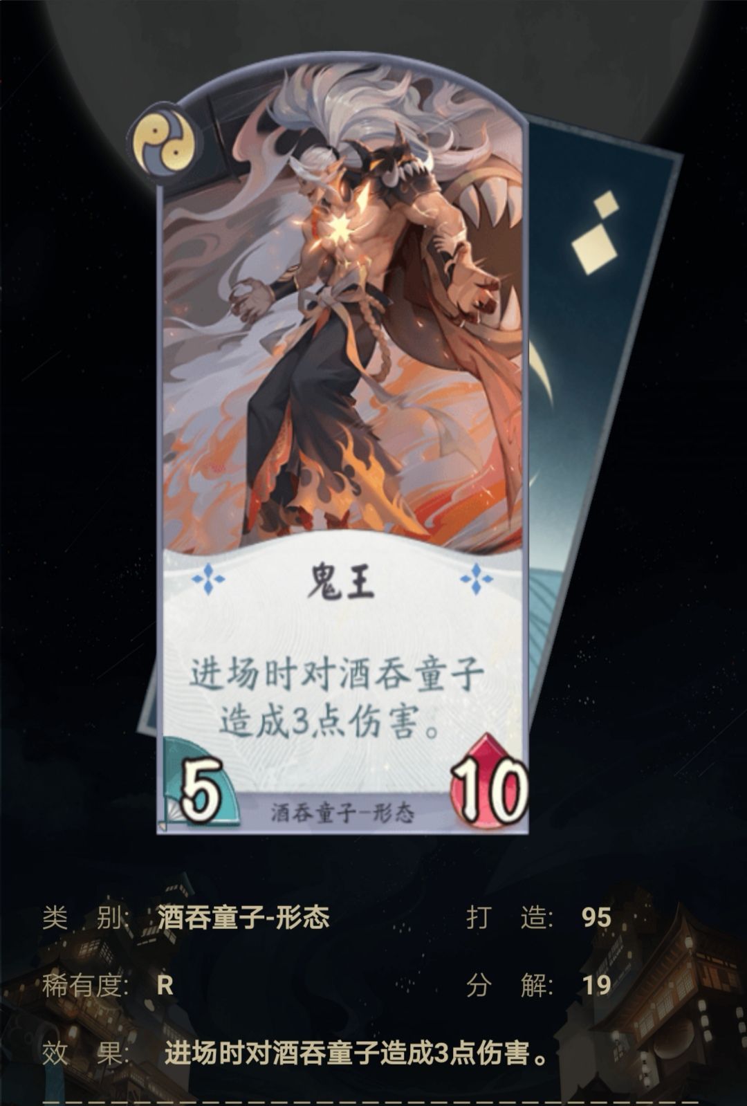 能使中期的酒吞童子一下子获得高攻且高血,且能触发一些卡的增强属性,是非常好的中期过渡卡牌,且进行抢血压场的绝佳卡牌之一。