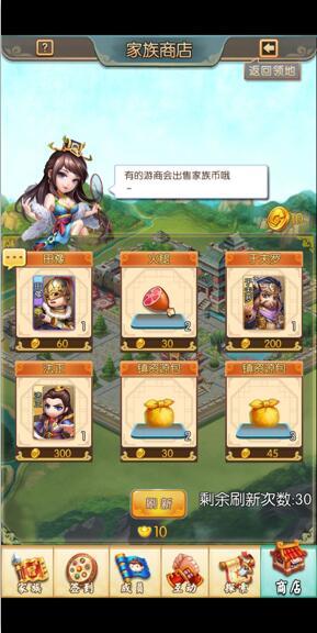 玩家可以通过消耗家族币商店购买兵种书、武将、体力、镇资源包,商店刷新物品一次10元宝;
