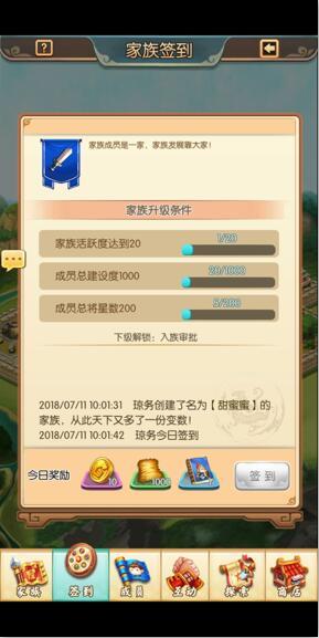 家族等级越高,家族成员每天签到获得的奖励就越多,签到界面展现家族升级条件内容,签到奖励内容;家族签到奖励每天只能领取一次,每日签到可以提升家族活跃度