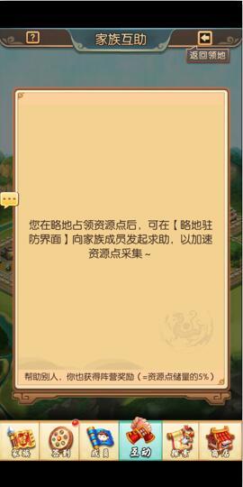当家族成员或自己被占领时,可以在这个界面发起求助让家族成员来帮忙,以免产生资源被占领;帮助别人的同时,自己也可以获得阵营奖励(=资源点储量的5%)