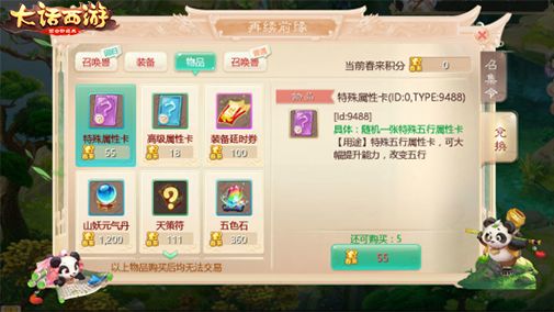 春来积分不仅可以用来兑换五色石、聚魄丹、龙之骨、玉符、高级属性卡等各种游戏道具,还能直接兑换萌宠小五叶和珍稀召唤兽山妖,还可以用于开启小五叶的技能格。使用抽奖券也有机会能够抽取到小五叶!万能的春来积分可以兑换海量好礼,赶紧行动起来,和自己的好友一起收集吧!