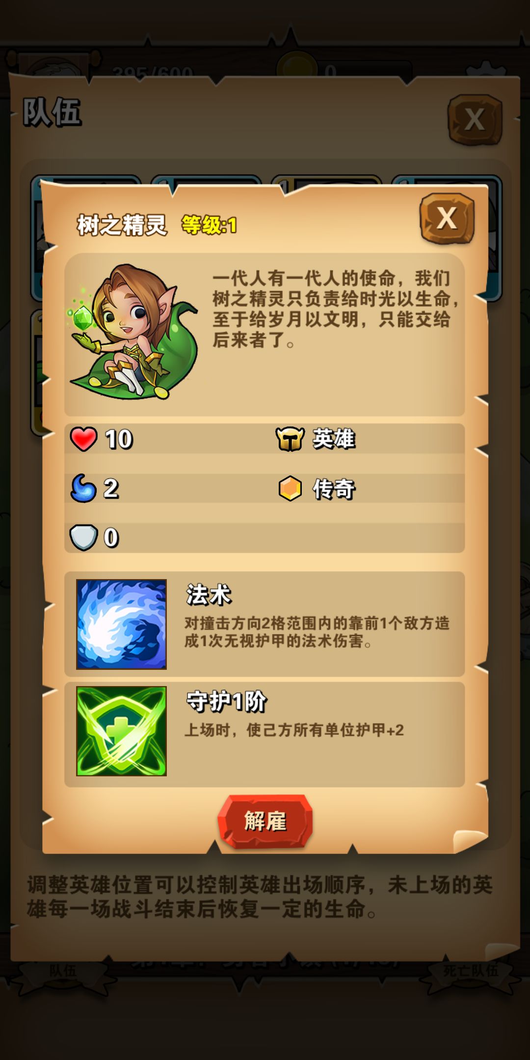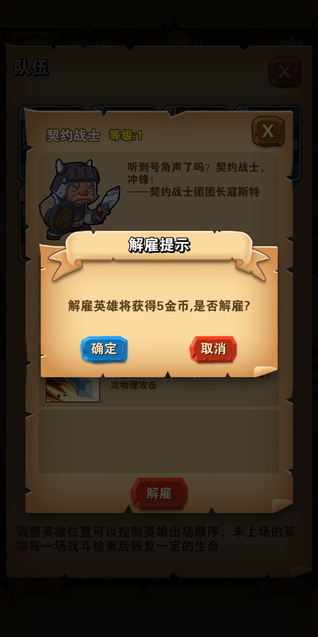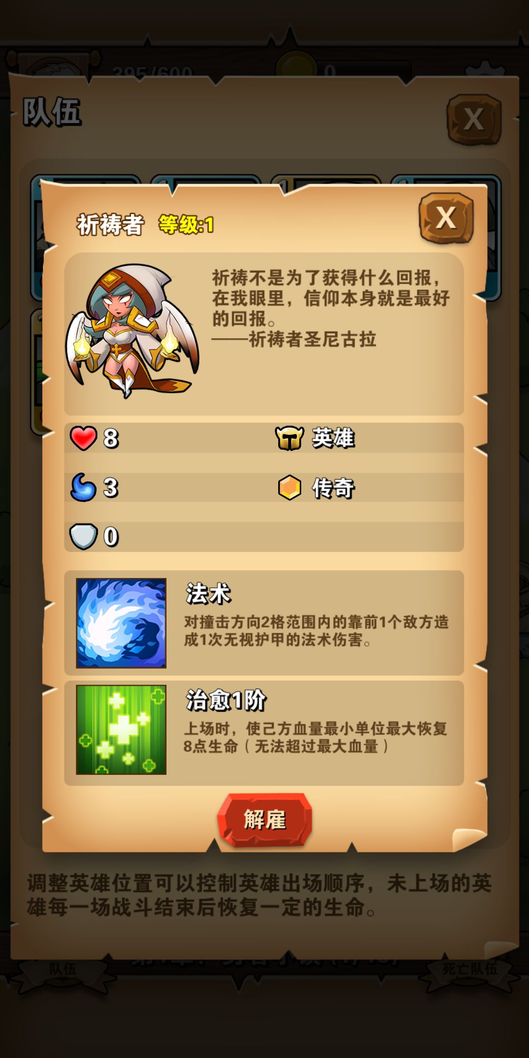 然后,是上场顺序的搭配和不需要英雄的解雇。因为每一个英雄的属性和特点都不一样,而在重要英雄后面放置一位能够加血的英雄将大有脾益。同时,对于那些作用不大的英雄大家可以解雇换成金币,用以招募更厉害的英雄。