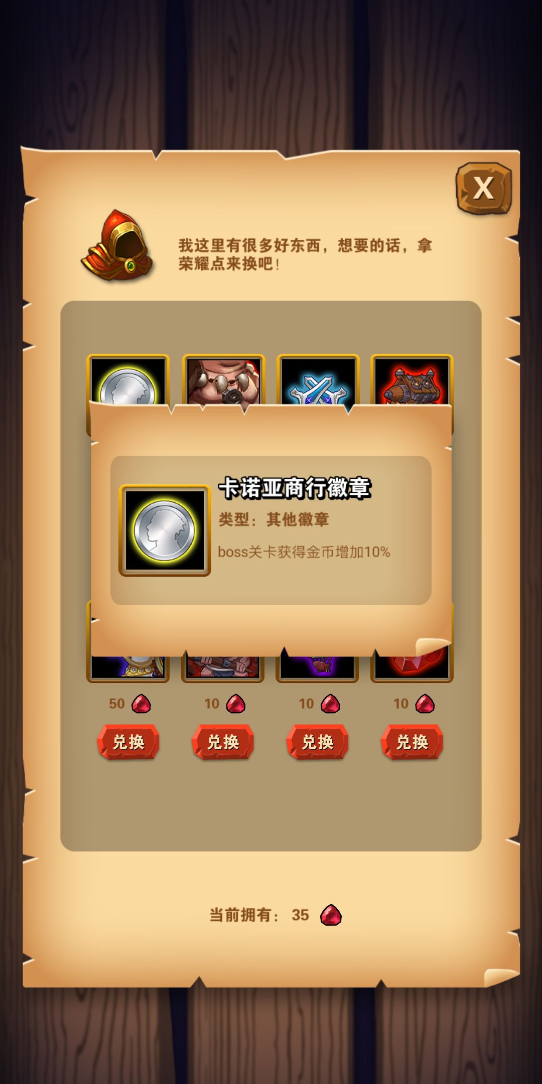 然后在技能选项旁边的是冒险徽章的选择。在这里我们可以选择减少升级金币、减少复活金币、提高部分英雄初始攻击力等选项。各位小伙伴可不过错过这个小细节哦,特别是增加BOSS奖励金币10%的选项我可是必点的!