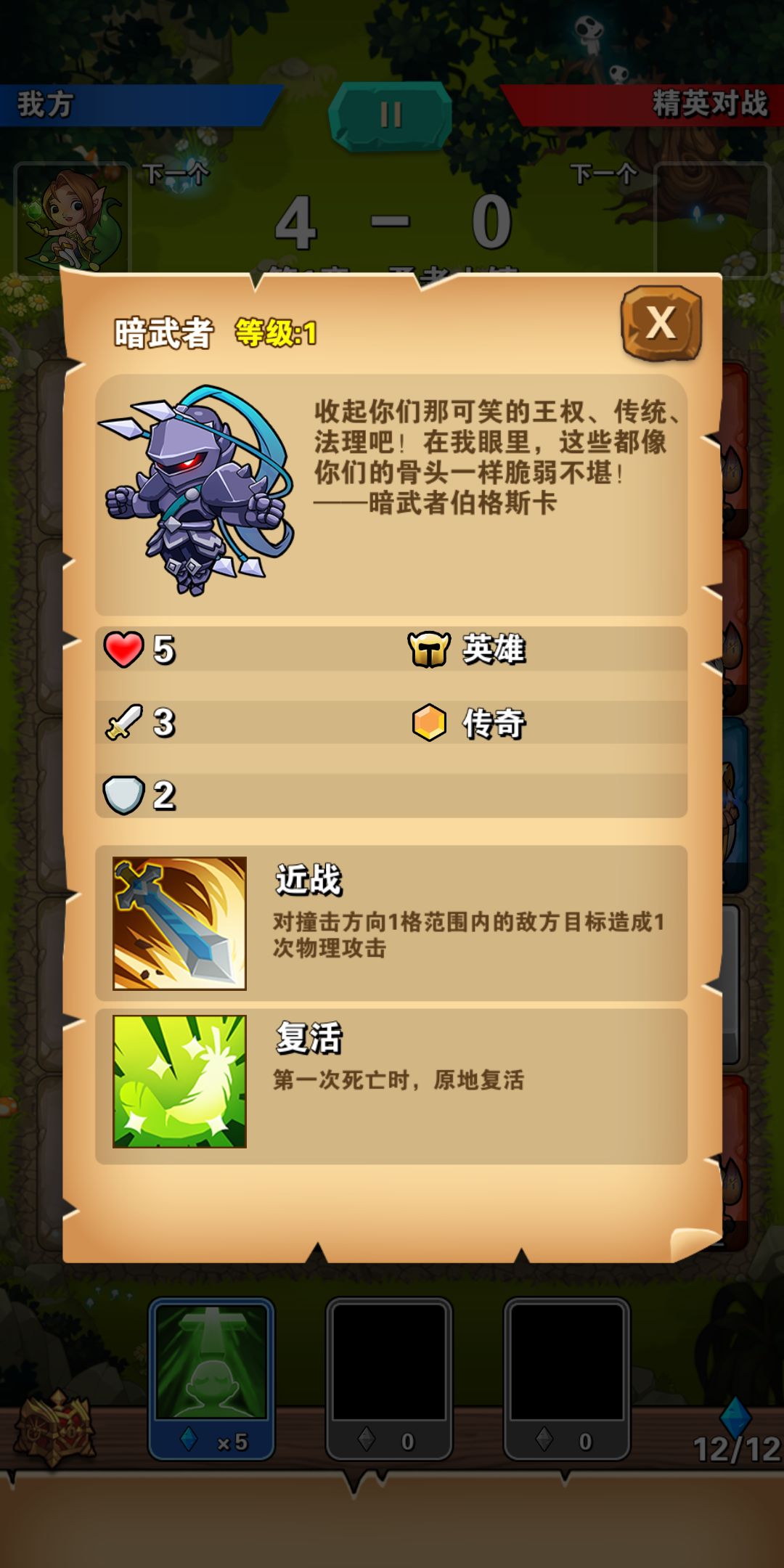 其中除了有可以为团队带来收益的英雄之外,还有可以在第一次死亡时,原地复活的暗武者。当他第一次上场被打死时,会满血复活在原地,拥有他在一定程度上等于拥有了两个英雄。