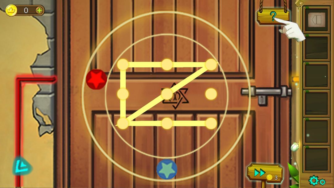 9.点击大门,出现9个黄色光点,按照之前的蓝色红色黄色法阵的样子,通过光点描绘出来,和手机解锁方式一样,需要一笔滑下来。滑动的方法很多,我就不过多赘述了。如图