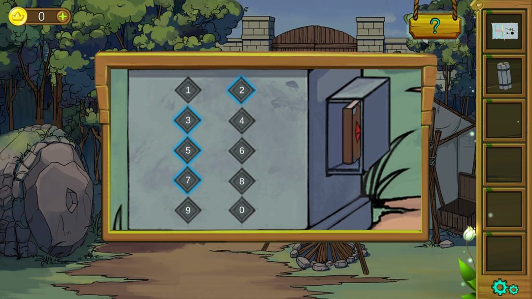 6.猴子密码为:2357(来自于手举牌中四个数字提示,在密码界面,分别点击四组数字,剩余的数字会组成是个新的数字即为2357),得到火系魔法书。