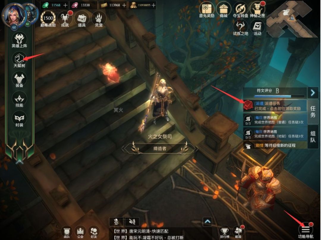 通过新手副本,此阶段玩家可根据系统指引一步一步了解到游戏的基本操作,比如技能释放方向的调整,NPC的位置等。玩家可解除到天赋、技能切换、和导航按钮中的其他功能。此阶段可一直向前挑战剧情副本,来提升自己的角色等级。注意导航按钮中的红点,根据提升一键提升自己的战力,方能在副本中游刃有余事半功倍。