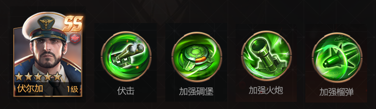 SS级英雄伏尔加,伏尔加作为最强防御英雄,有着优秀的全兵种防御属性加成技能,配备任意阵容可全面提升部队防御属性,极大提升单位生存能力,驻防英雄委任时,可提高城防实力,可镶嵌伏击、加强碉堡、加强火炮、加强榴弹芯片,当英雄驻防在围墙时,可增强城防武器的攻击力。