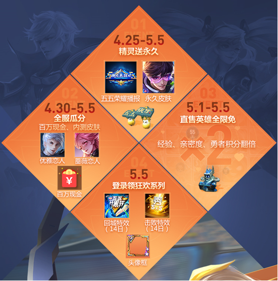 至5月5日每日登陆游戏,五五狂欢豪礼赠送超多惊喜!专属皮肤新鲜上架、限定皮肤限时返场、限定手办带回家,更有机会瓜分百万现金和内侧皮肤…