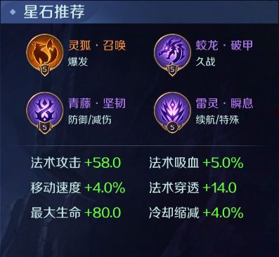 蓝绿星石首选法术强度和法术穿透来配合孙武的被动技能加强爆发能力。紫色星石推荐灵狐,青藤,雷灵,保证自身更为强大的爆发的同时,提升自己的防御能力与持续作战能力。