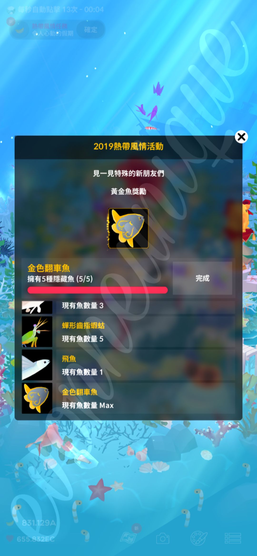-如何解锁与拿到 鱼类清单里的5种新种类隐藏鱼呢,其实只需要 按左边蓝框框 或右边的蓝框框的 ‘‘创造生命’’ 就会以 ‘随机’ 的方式得到隐藏鱼, 得到5种隐藏鱼后才会得到最终奖励 "金色翻车鱼"。