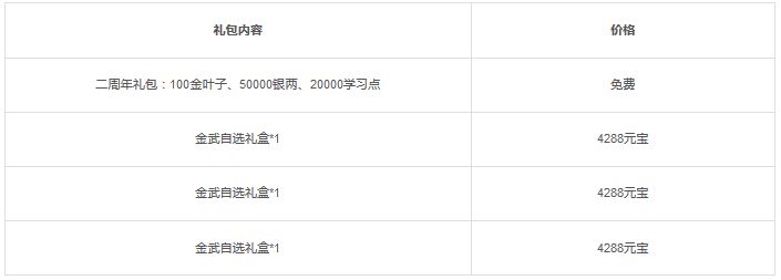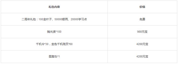 活动三:活动期间将限时上架二周年庆礼包,礼包内容如下: