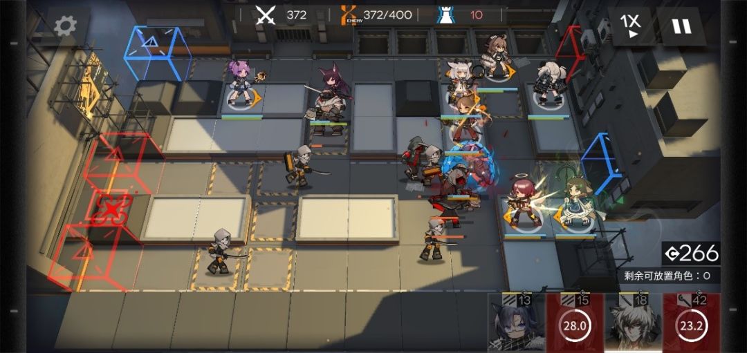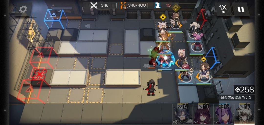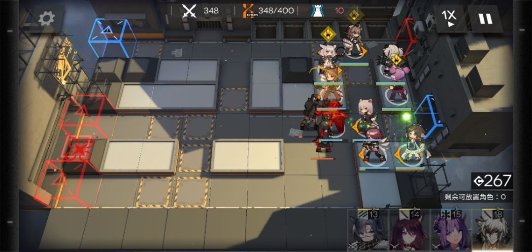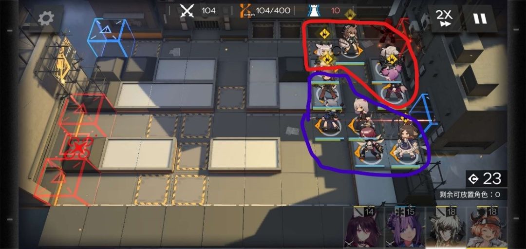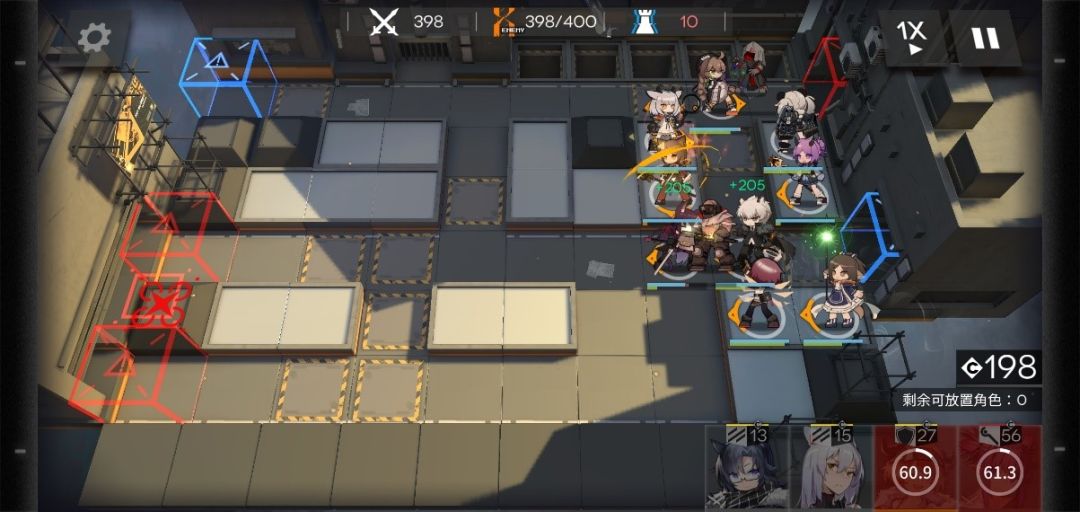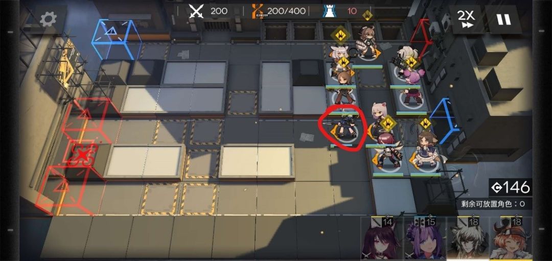 在350波时,有3个敌人偷家,分别2个精英术士,1个伐木机,这个时候上方防区压力也开始增大,炎熔先开大,能打多少打多少,下方防区主力够抗不用担心,撤下后排先锋,腾出两个可放置角色,一个放玖剑圣,一个放奶,位置如下。