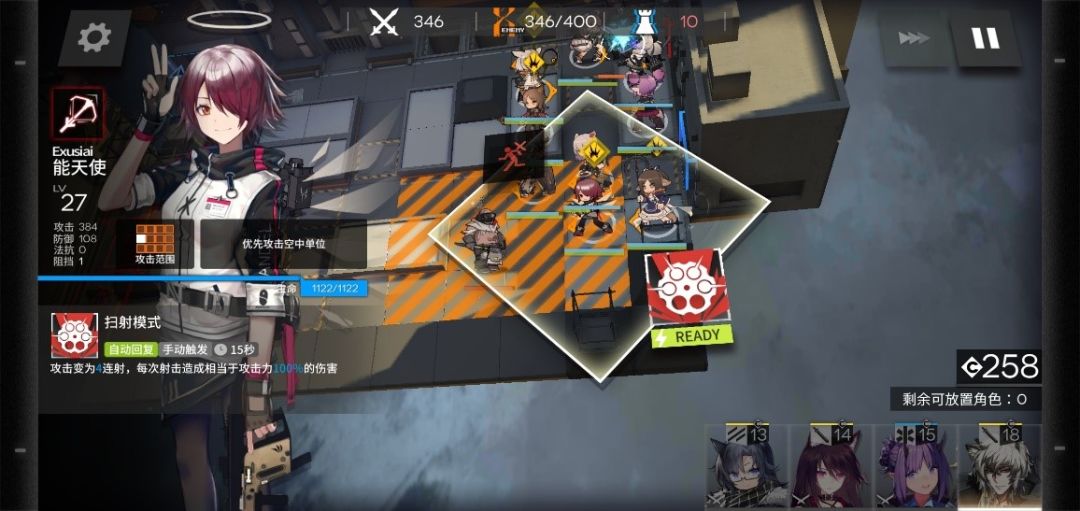 之后不痛不痒来到340—350波,300-340波上方防区注意开技能就行,这里到346波时下防区全体开一波技能,技能是狙击先开,先秒伐木机,重装敌人到,天火开技能,治疗,重装技能同时跟上。