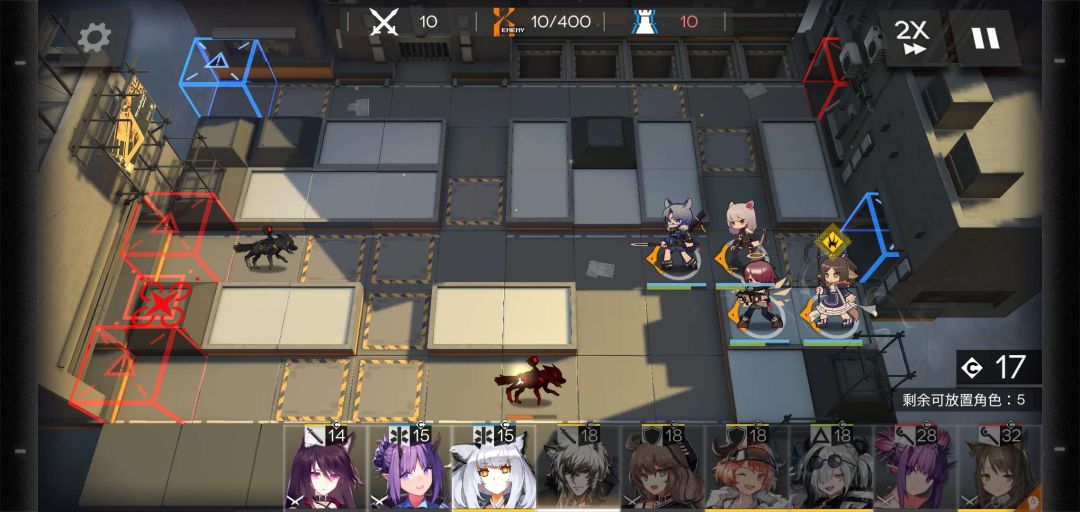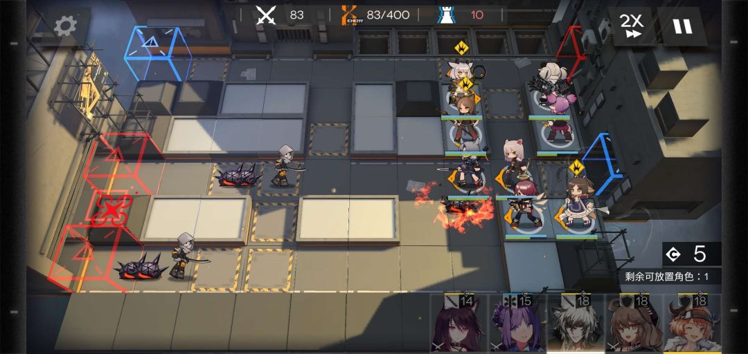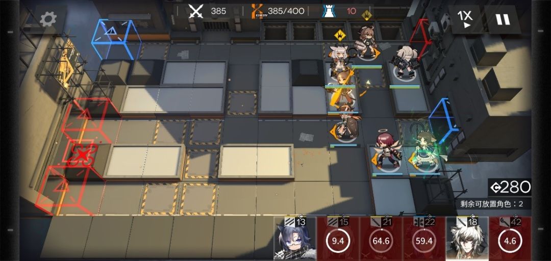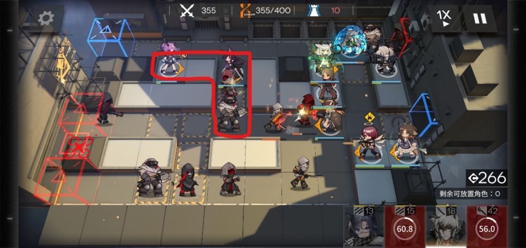 挂机到300,该关卡第一个难点来了,双高阶术士,盾的肉度不够,瞬间崩盘,奶量跟不上,也是瞬间崩盘,这个术士行进路线为一上一下,这时候考验你狙击的爆发的时候到了,下半防区技能全开,如果崩了,说明英雄练度不够,回炉重造,但一般是能过的。