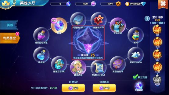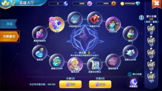在许愿的过程中,已经拥有的英雄在许愿中不会重复获得。每许愿1次,都会增加一定数量的幸运值,幸运值越高,获得稀有物品星魄的机会越大,当幸运值满时,必定获得星魄。幸运值只对稀有物品星魄进行概率加成,在获得稀有道具星魄后才会进行清零,其他任何情况都不会清零幸运值。