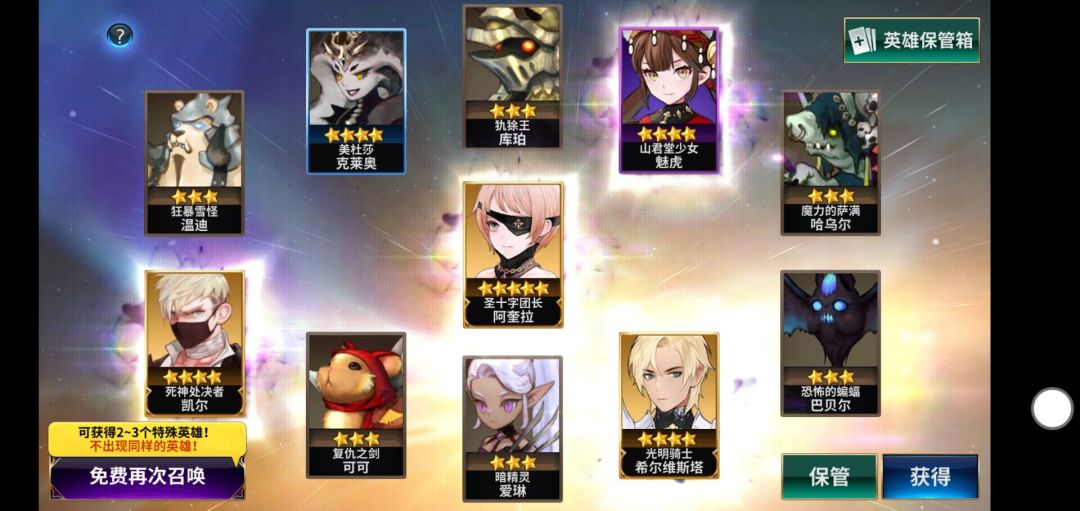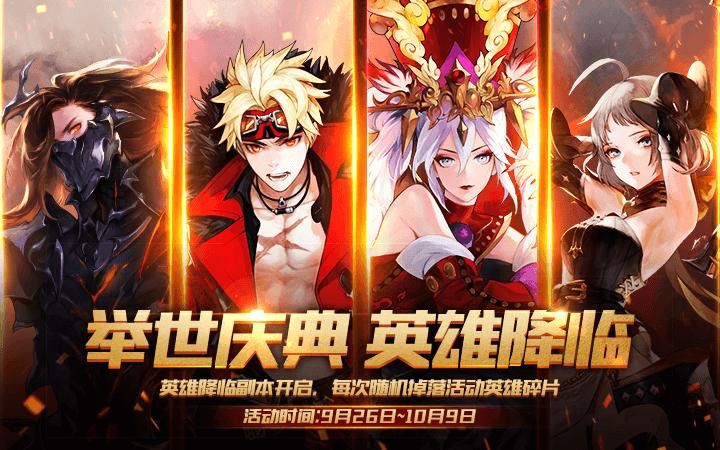为了迎接国庆节日的到来,特别举行了英雄降临限时活动,在活动期间内,限时开启英雄降临副本,每次通关后将随机掉落以下一种奖励:希尔维斯塔英雄碎片*3、魅虎英雄碎片*3、阿奎拉英雄碎片*3、莱恩英雄碎片*2。每天可进行3次。