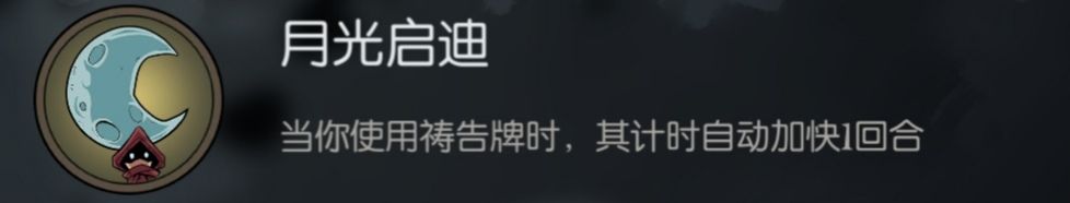 初始卡组的配置中,拥有2张攻击祈祷,在拥有祝福 月光启迪 的前提下,祈祷回合数在面对章节boss之前,是没有必要达到3回合的,2回合的7伤害的原始祈祷在月光启迪的辅助下,变成了1回合后7伤害,这个伤害对多数的一章怪是很高的,更别提还有普攻配合输出,足以应对大多数小怪。而在面对章节Boss时,原始3回合祈祷伤害基本是足够的。