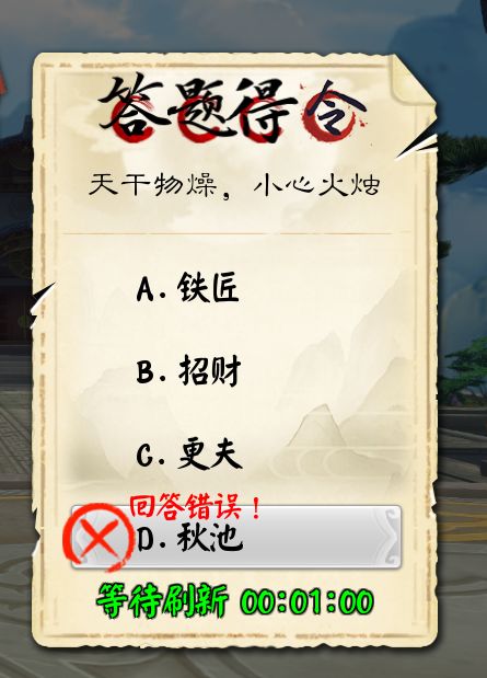 当然,回答错误也没关系,答题任务会进入1分钟等待刷新的时间,刷新完成后,玩家又可以继续答题了。