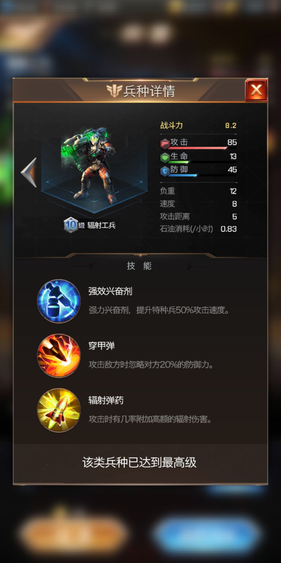 既然要发展特种步兵流,那当然要对特种步兵有相应的了解,特种步兵算是一种脆皮输出兵种,略显极端,在拥有极高攻击力与极为强大的攻击技能的同时,自身的血防属性显得十分弱势,因此如果没有得到很好的保护的话,就会在高收益的同时面临高损失的风险。特种步兵拥有兴奋剂,穿甲弹,爆破弹药三个技能,可以在面对敌方肉盾前排时候打出成吨伤害。