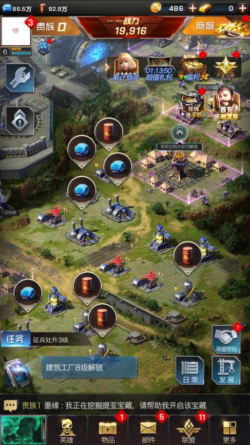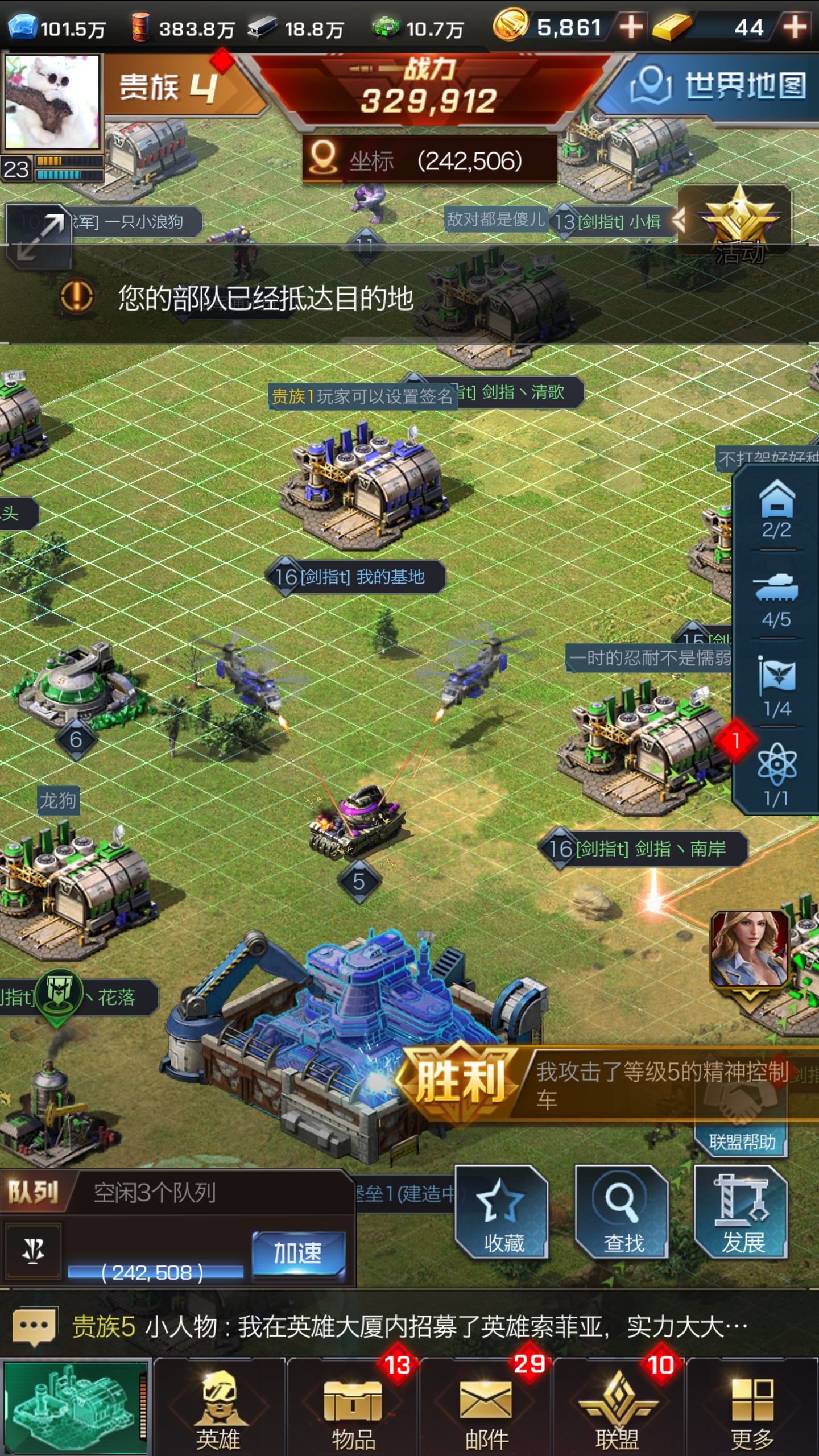 游戏里不同的建筑需要不同的资源来升级,无论是选择注重兵种搭配还是主升一个兵种,每个人都可以充分发挥自己的脑力,通过各种奇思妙想来取得胜利。例如当同一阵营的盟友联手攻打敌人时,通过侦查发现敌方基地驻守了大量步兵时,可以利用兵种克制调用极限武装直升机阵容来进行针对,当获得胜利后,那种找到了通向胜利的钥匙的感觉真的是让人非常兴奋。