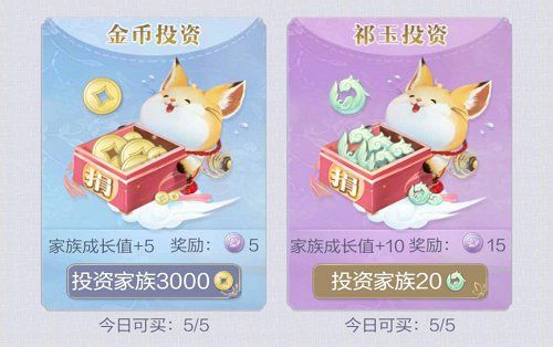 大人每日可捐献“金币”或“祈玉”为家族提高成长值,同时获得“家族币”奖励。
