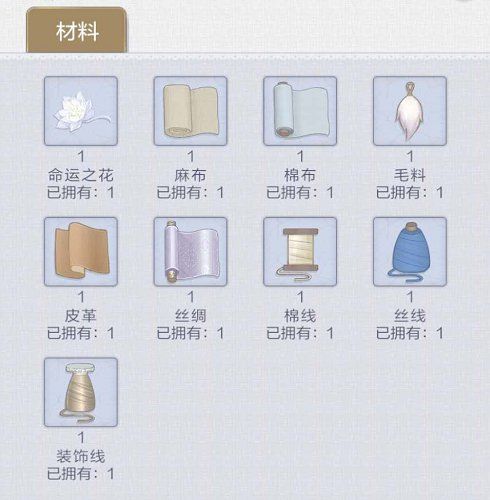 许愿池道具:命运之花、麻布、棉布、毛料、皮革、丝绸、棉线、丝线、装饰线