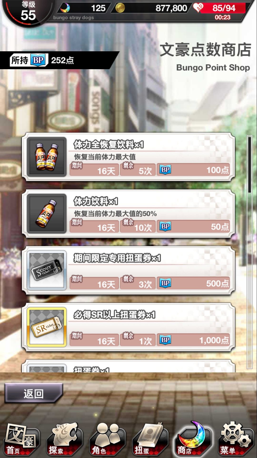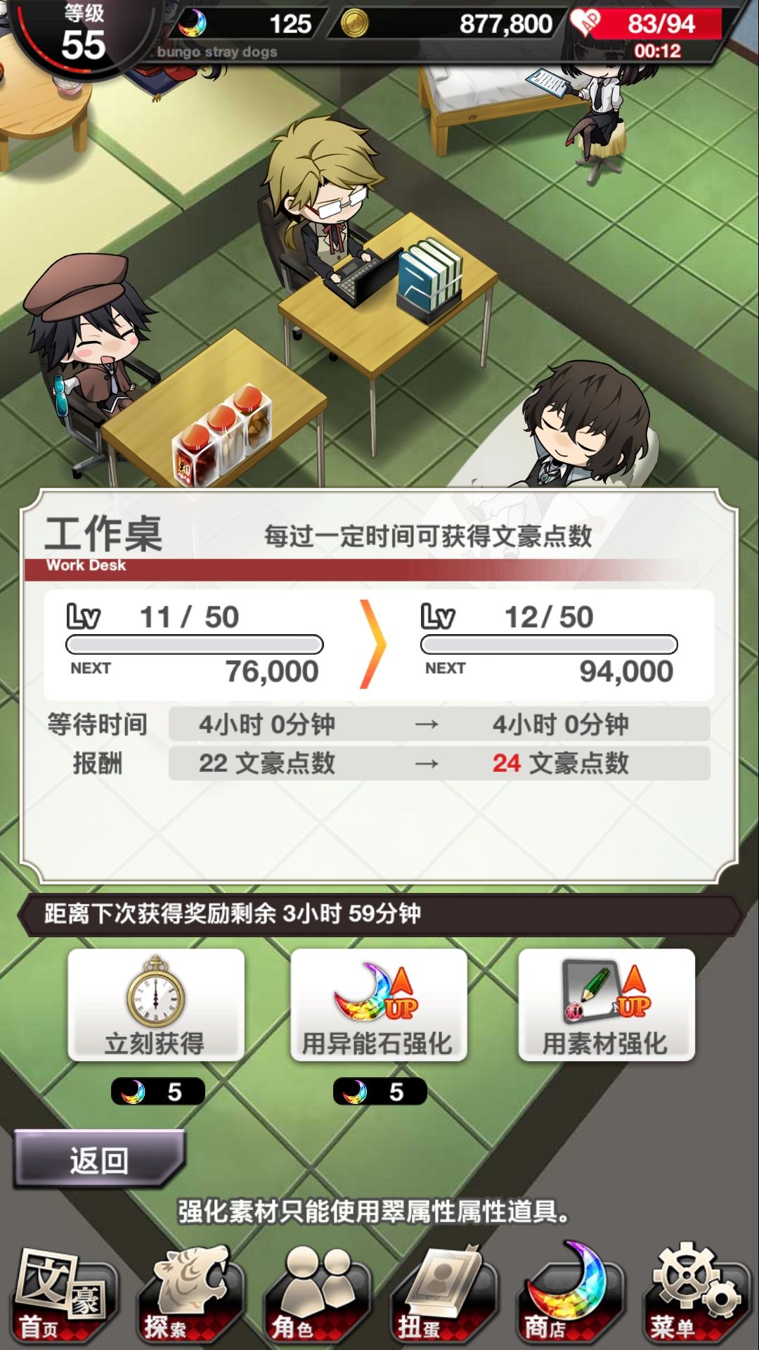 个人来讲如果没有特定厨的对象,可先升级太宰的沙发以及国木田的办公桌,一个是提高道具掉落率,另一个则是获得文豪点数。文豪点数可以算是游戏里的另一种通用货币,在商店里可兑换相应奖励。其中比较重要的就是期间限定扭蛋券,可以在限定池中进行召唤。而文豪点数的获取途径也不算多,比较多的就是出售角色,另一个就是国木田的办公桌的奖励。因此你懂得,升级国木田的办公桌让这个固定产出文豪点数的地方可以效率更高一些。