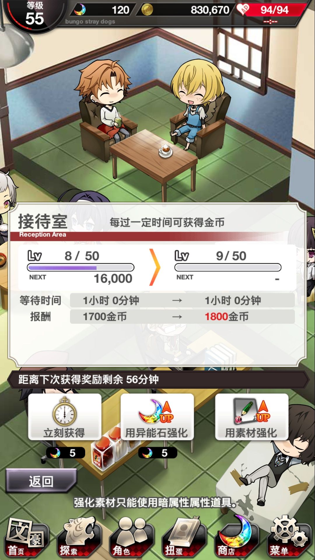 而就奖励而言,接待室的奖励是一定时间内获得金币奖励;餐桌奖励为进化素材;点心箱的奖励为随机道具,工作桌的奖励为文豪点数,诊疗室的奖励为强化素材,而个人觉得最重要的则是太宰的沙发奖励——提高道具掉落率。这一点对于活动副本来说还是比较重要的一个buff,而在平时肝素材的时候也可以更加省时省力。