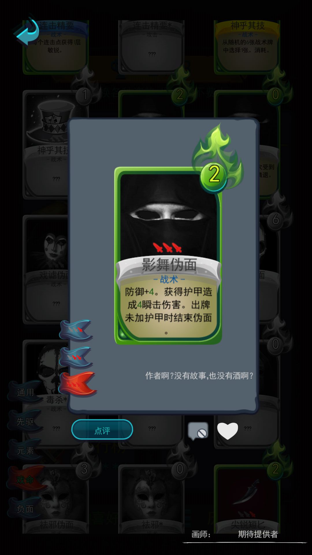 这个套路最怕的,就是有弃牌技能的怪,一旦被弃掉影舞和隐蔽就只能打出gg了,所以建议是:不要那能重复使用的卡,最好就是装备,不然就会打乱堆叠节奏。也不要拿太多,不然不好度过前期,容易暴死。考虑到叠到后期以后,减伤的收益来看,宝物“颤抖”(事件“蜃影盆栽”极大概率获得)和“天平”有待商榷。尤其是“颤抖”。由于不知道减伤上限,如果两个“暗影魔戒”的减伤能到80%的话到还能拿,可以快速叠减伤,没有的话性价比实在不高。