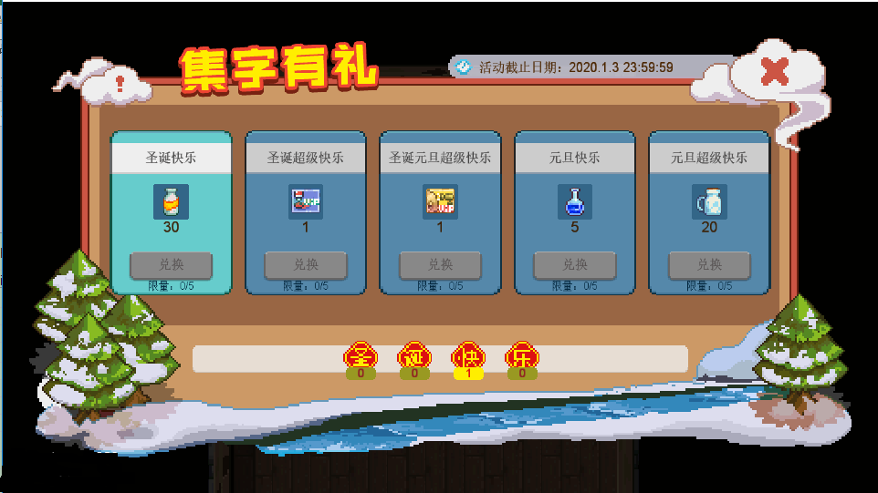 无论新老玩家,在12月24日中午12:00更新完毕后,登录即可开启集字有礼活动~小伙伴可以通过伐木、采石、拾荒、钓鱼与订单获得相应的字符,兑换丰厚的奖品~ヽ( ̄▽ ̄)ノ