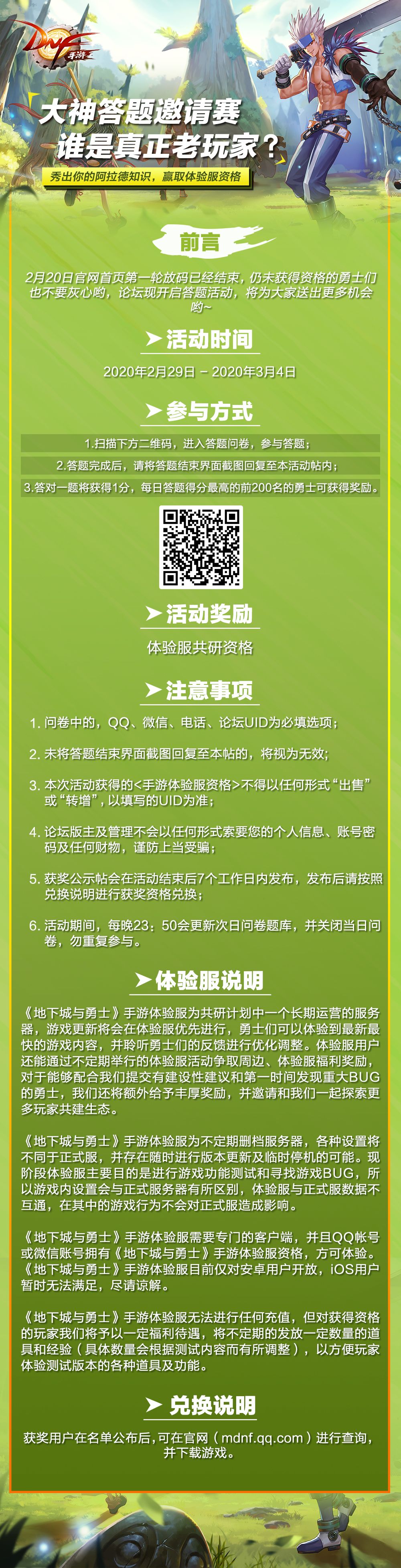 DNF手游在2月29日上午10点,已经在游戏官方论坛开启了新一轮论坛抢码活动!玩家可在2月29日~3月4日期间,通过官方举办的“大神答题邀请赛”赢取体验服资格,每日答题积分排名前200的玩家将获得体验服测试资格!