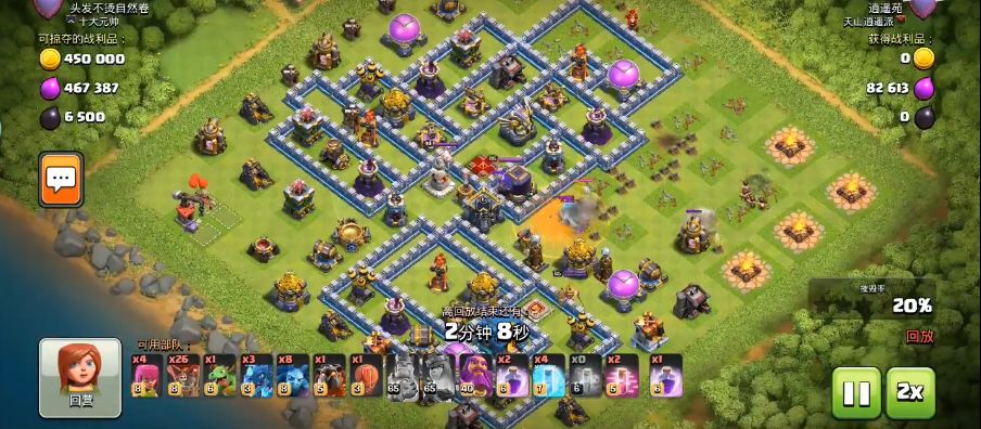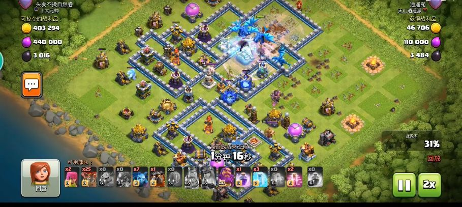 确定好战术后,我们直接面对敌阵的天鹰火炮和援军城堡派下我们的双王,在开技能后我们的双王虽然英勇牺牲但给我们的大部队创造了优良的输出环境并且引出来了援兵,既然敌阵的援军是两个陆军的冰人,对我们的空军大部队构不成任何威胁,那我们可以直接结束第一步的清边,展开下一步的进攻。