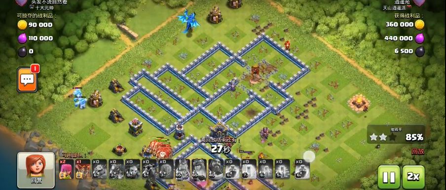 第二步我们展开正式的进攻,面对敌方的天鹰火炮我们立刻派下我们的三条雷龙和我们的攻城气球,由于进攻者对天鹰火炮触发人口巧妙的控制,天鹰火炮还没有发力就被我们的雷龙加狂暴法术全部撕成了碎片,雷龙展现出了它的imba之处,那就是能够在敌方防空火箭的输出范围之外用雷电弹射拆掉了敌阵南边的防空火箭,那么我们的三条雷龙们自然是犹如出入无人之境,轻松推平了敌阵北边所有的建筑物。接着我们的狗球大部队以及大守护者直接向变成防御模式的敌阵大本营发起进攻,这时敌阵已是强弩之末,我们靠着大守护者的技能不费吹灰之力就轻松拿下了三星。