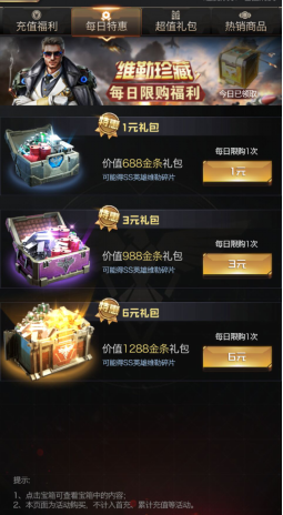 在游戏中点击右上角的商城系统,就可以看到一个每日特惠选项,切换到每日特惠界面,可以看到1,3,6元礼包,这些礼包打开后都是有机会获得英雄碎片的,但是每日只能每种礼包购买一次,因此玩家们如果想通过这个方法来快速练出高级英雄,还是不现实的,只能一天天的积攒,不过俗话说积少成多,相信玩这个游戏的玩家都是有一定耐心的,玩久了也自然会攒够相应的英雄碎片吧。