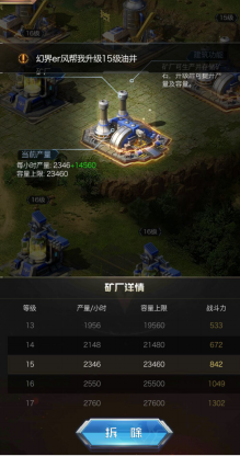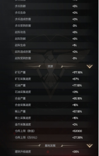 而对于倾向资源发展的佛系玩家,这里可以建10个矿厂,1个油井,8个维修厂,1-4个征兵处,其他的同样建造合金工厂或者稀土矿。原因在于,随着部队规模的扩大,是要消耗非安全资源的石油资源的,而资源矿生产的资源都是非安全资源,16级的仓库可以保护46W的石油资源,但是并不能满足升级需求,所以油井的产出并不能依赖建筑城内资源。在16级,战略点发展系增产、科技矿产生产I点满的情况下,10个16级矿厂1小时能产出将近20W的资源,还是非常可观的。