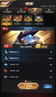 但是如果你比较有耐性,那可以等到下个月,一般游戏总会有有一些充值返利活动开启的,到时候直接充个328,不算太多,但是能有6560的金条,假设你上个月买了月卡,那么你就已经是贵6,贵6专属礼包768,买完剩下5792金条,不要着急乱花,因为在建筑工厂升级到关键等级,如13级、16级都会出现一个限时礼包,可以获得大量的加速与资源,在前中期觉得的物超所值,礼包内容足够你让建筑工厂升级到下一个关键等级。